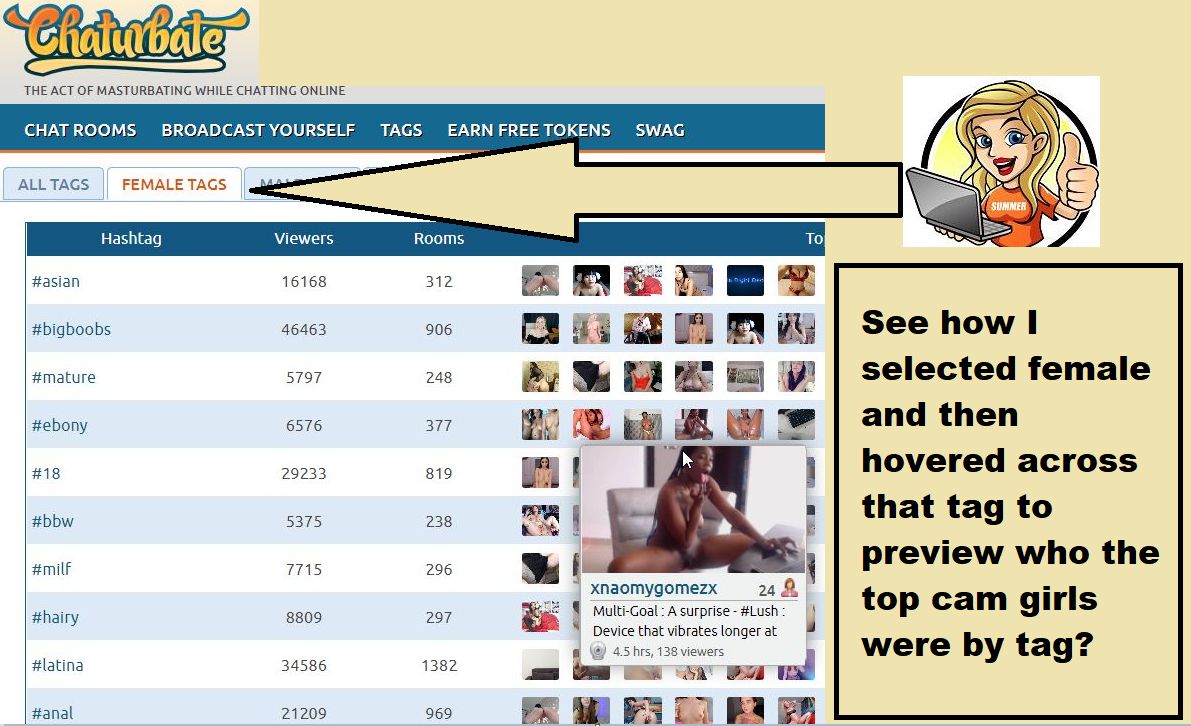 However, chaturbate has tabs above that for tags for female, male, couples, and trans as well. This of course means you can go to the Chaturbate female tags, choose a tag, and hover on that model to see who is the top model by tag at any minute of every day.