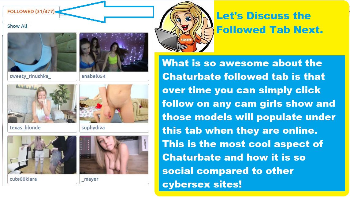What is so awesome about the Chaturbate followed tab is that over time you can simply click follow on any cam girls show and those models will populate under this tab when they are online.