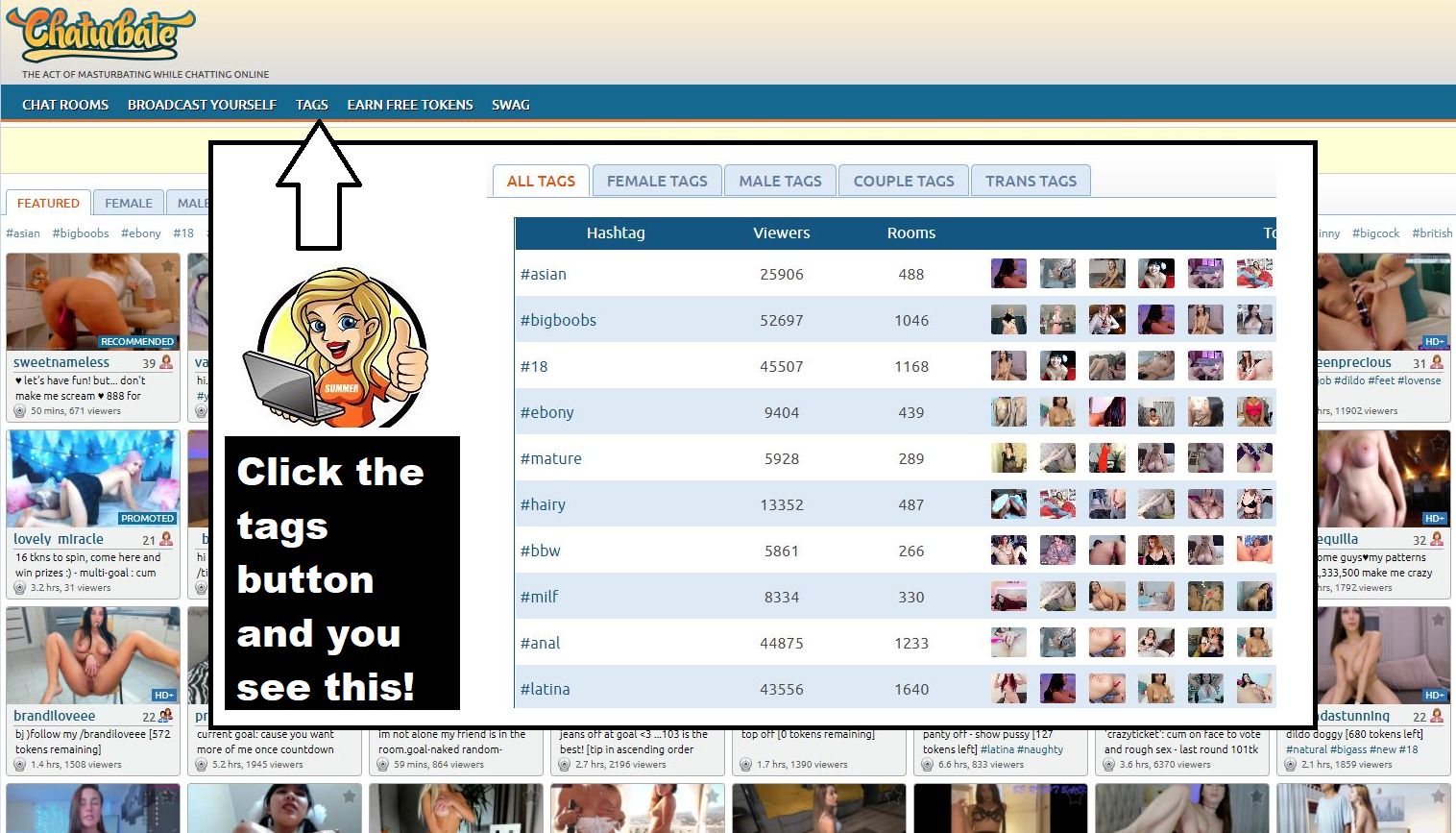 First of all, the top rooms (which means the cam models with the most viewers are ranked in order there) and the total number of viewers across that tag as well as the number of rooms is displayed.
