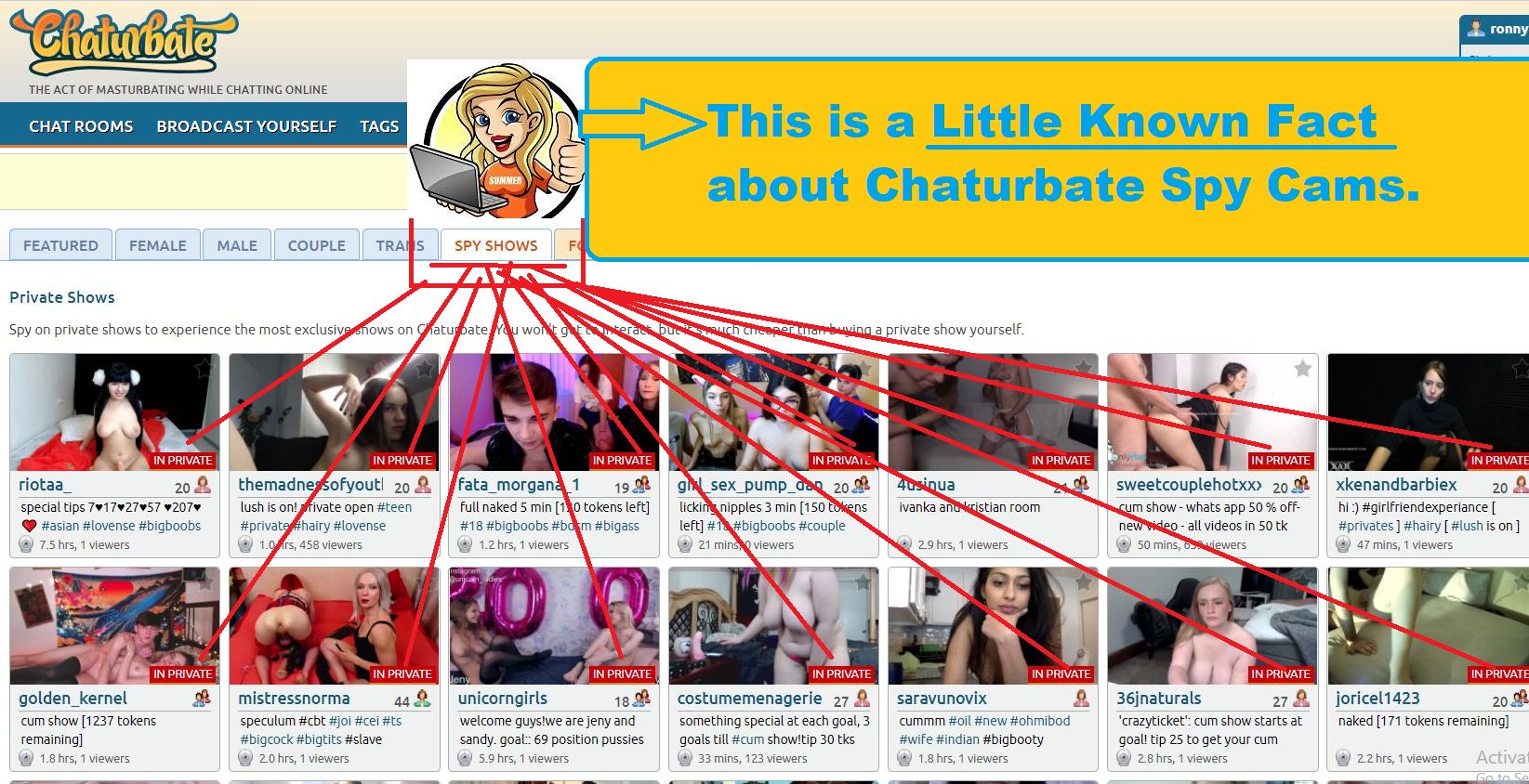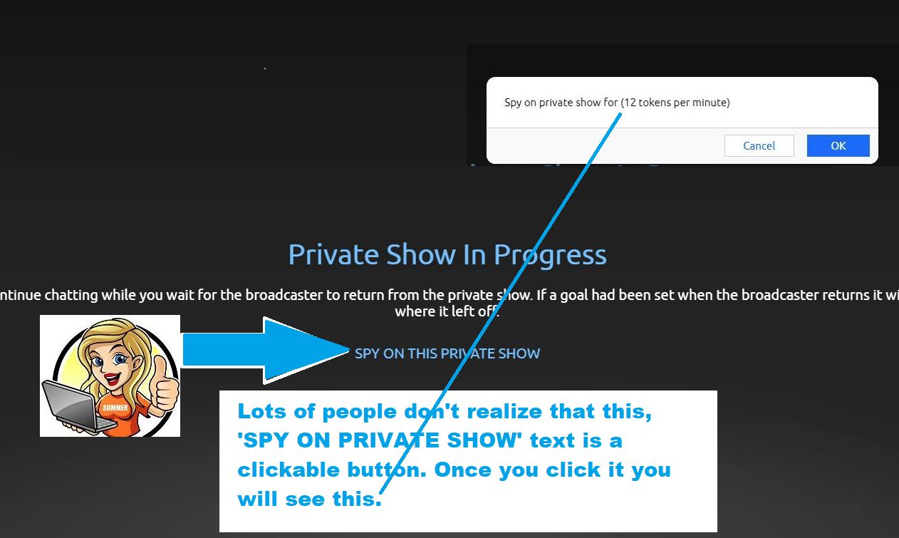 It’s pretty wild how many people are not hip to Chaturbate spy cams, but once you click on an, ‘in private’ chaturbate cam girl and then ‘decline’ you see the tab for, ‘spy shows’ populate which displays models on chaturbate who allow private cam show spying. This only happens if you are logged in and already a user.